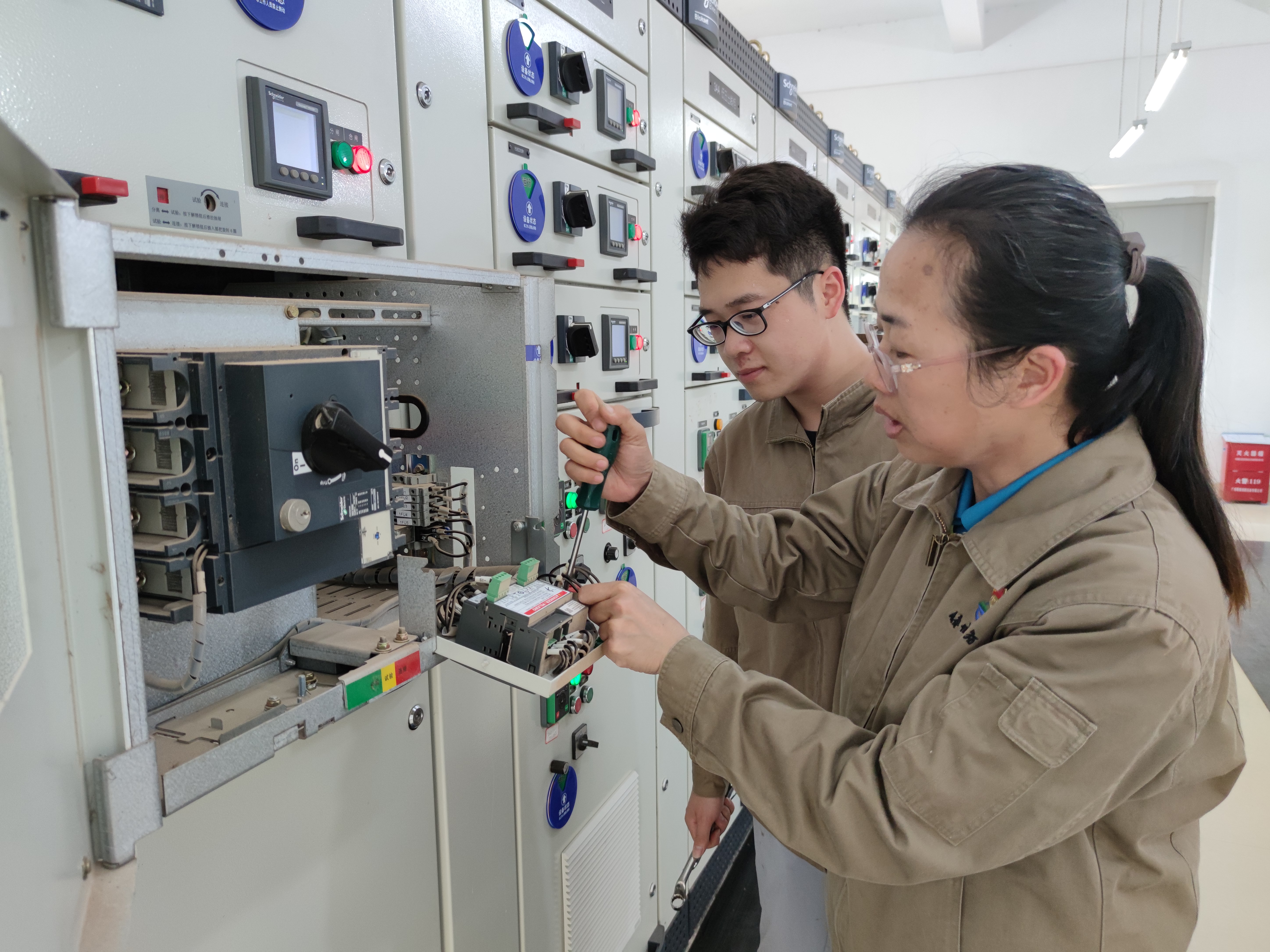 圖為江南污水處理廠黨員技術(shù)骨干覃映玫向新員工傳授低壓斷路器的維修技巧。韋嬋 攝