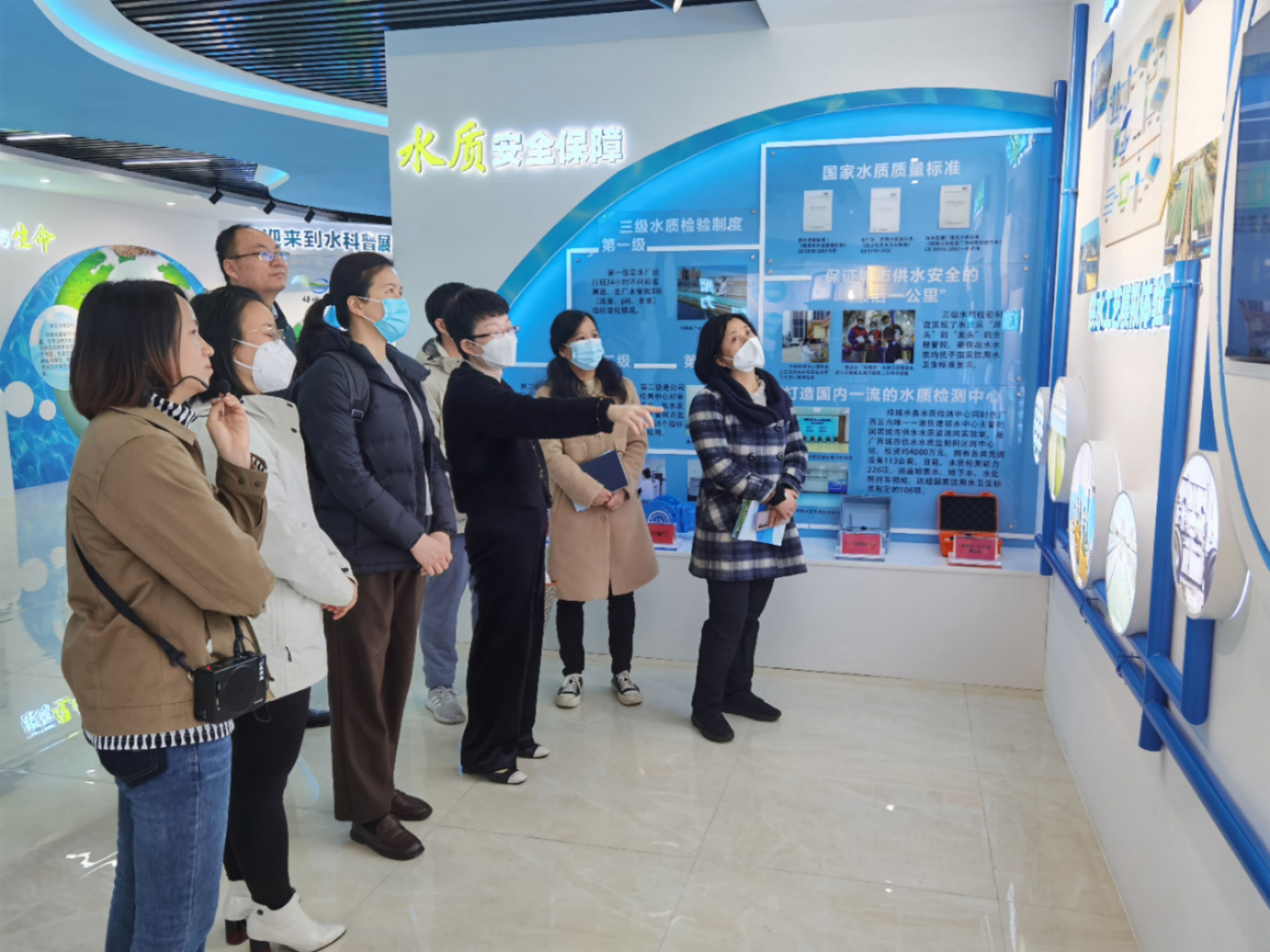 來訪人員先后參觀了江南水質(zhì)凈化廠水治理成效展廳、水知識科普展廳,了解水的常識,以及公司在水質(zhì)安全保障、污水處理流程、水質(zhì)檢驗制度、便民智慧水務(wù)上取得的工作成效。最后雙方實地參觀了江南污水處理廠的三期工程和中水回用景觀在水一方,直觀地感受了污水處理的先進工藝流程。