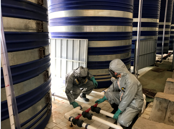 ▲水廠開展防次氯酸鈉泄漏應(yīng)急演練現(xiàn)場。
