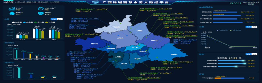 綠城水務大數據平臺于2019年9月啟動建設,于2020年12月建成,主要包括數據機房和平臺軟件建設,投資約1100萬元,該平臺于2021年6月取得了國家版權局頒發的計算機軟件著作權登記證書。綠城水務大數據平臺是綠城水務整個智慧水務項目的數據大腦,平臺按“一個中心、三大體系、五大板塊”的架構設計,整合了營銷收費系統、報裝系統、生產調度系統、地理信息系統、供水服務熱線系統的運行數據,通過可視化圖形直觀呈現平臺數據,以更加“智慧”的方式輔助水務企業進行管理和運維,為業務開展及管理決策提供了精準、及時、有效的數據支撐,保證可靠供水,降低產銷差,提升運營管控能力,以數字化轉型賦能企業高質量發展。