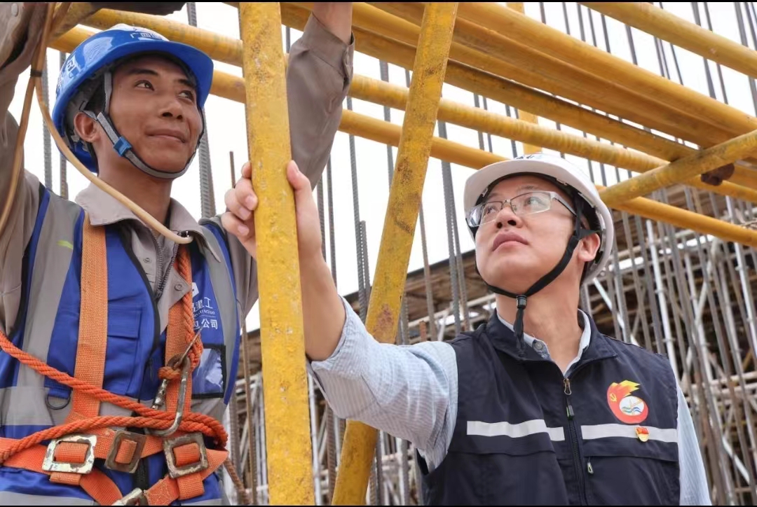 (“水工兵”建設先鋒隊隊員覃長瑜(右)正一絲不茍地和施工方查看鋼筋綁扎情況)